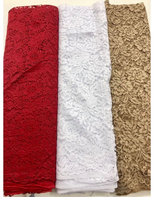 Pizzo macramè rosso, bianco e sabbia.
